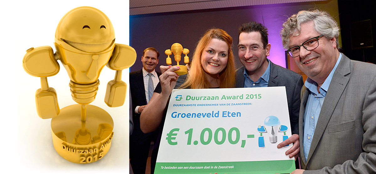 Voor Duurzaan organiseren we ieder jaar een verkiezing voor de meest duurzame ondernemer/onderneming van de Zaanstreek. De winnaar ontvangt naast een gouden beeldje van onze avatar, een cheque van 1.000 euro te besteden aan en duurzaam doel. De winnaar van 2015 was Groeneveld catering, in 2016 Brouwerij Hoop.